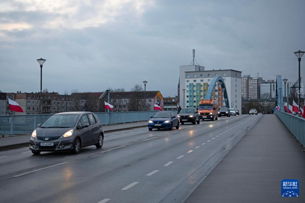 3月16日,车辆通过德国和波兰边境的奥德河界桥从德国奥德河畔法兰克福驶向波兰斯武比采。新华社记者 张豪夫 摄