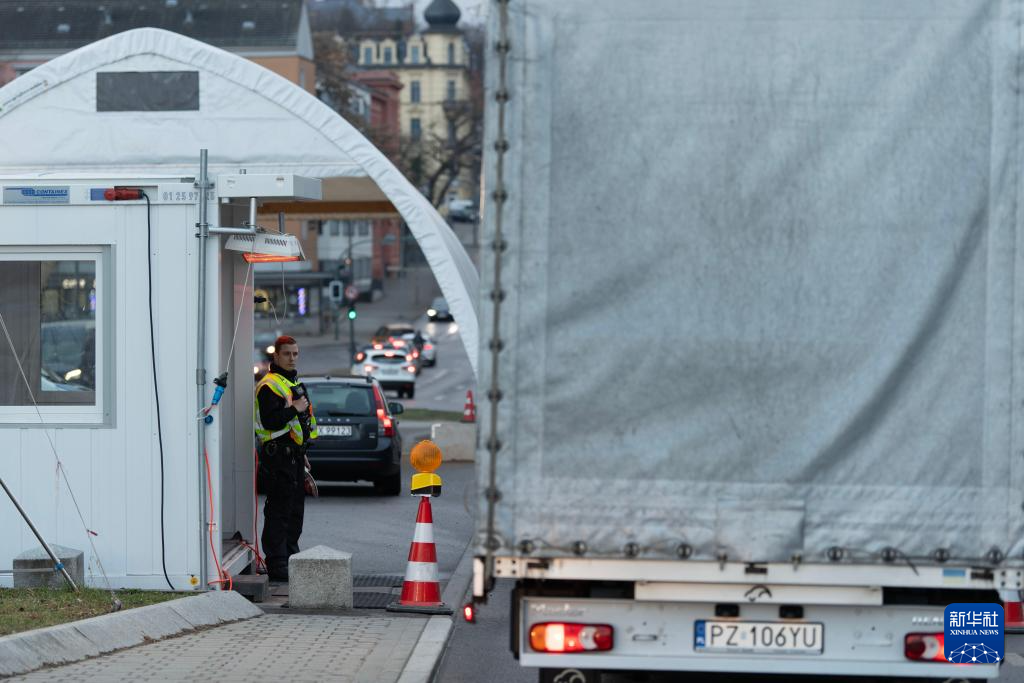 3月16日,在位于德国和波兰边境的德国城市奥德河畔法兰克福,警察在边境检查站执勤。新华社记者 张豪夫 摄