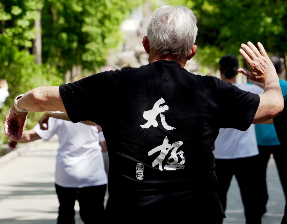↑2021年8月8日,河北省邯郸市的太极拳爱好者在练习太极推手。