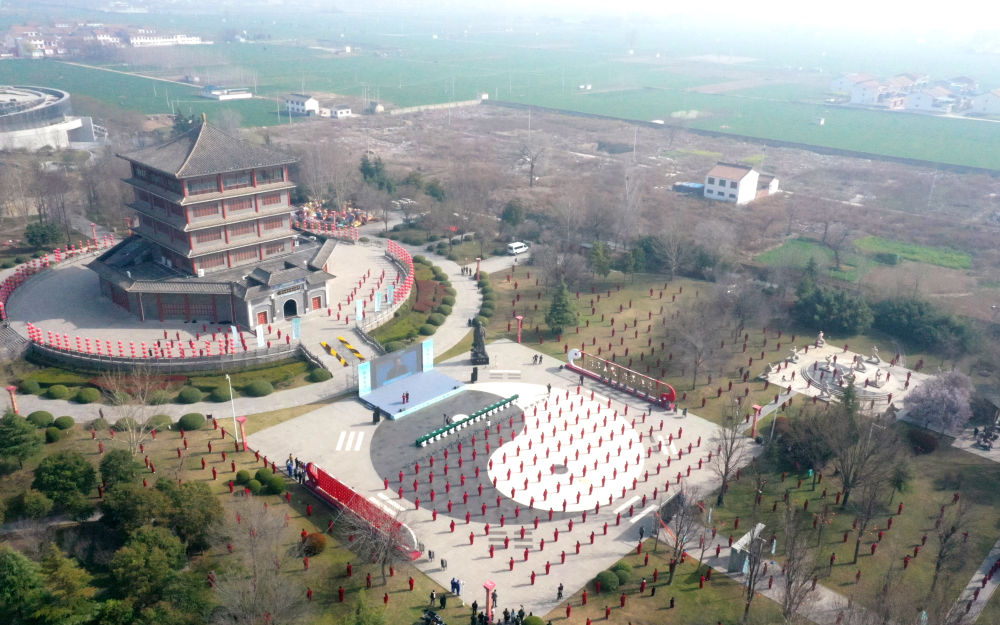 ↑2020年12月16日,太极拳爱好者在河北省邯郸市永年区太极小镇习练太极拳(无人机照片)。