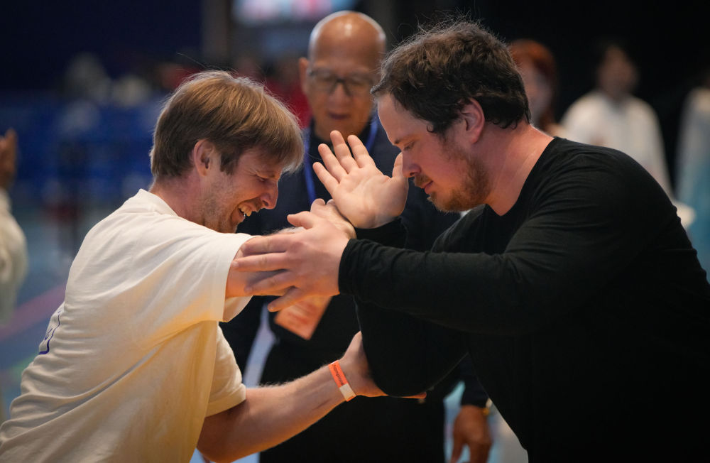 ↑2024年6月15日,在加拿大温哥华,两名选手在第42届加美国际武术锦标赛太极推手项目比赛中。