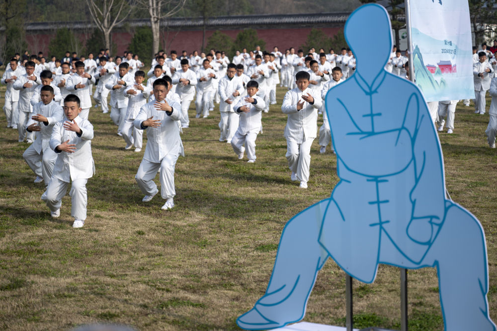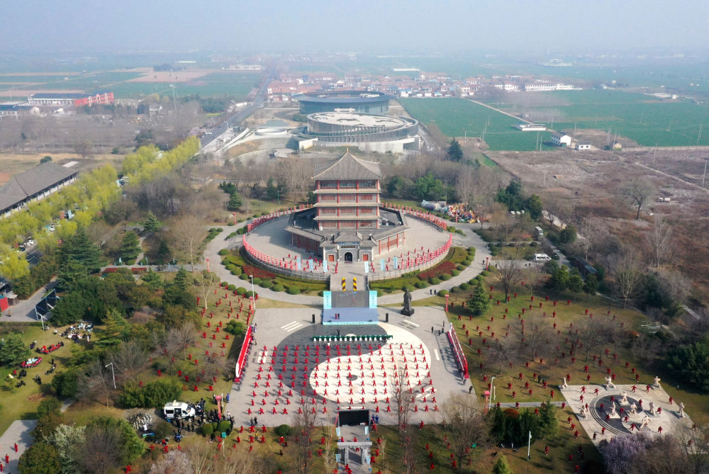 ↑2026年3月21日,在河南省温县中国太极拳博物馆前,太极拳爱好者进行太极拳展演,庆祝首个“国际太极拳日”。