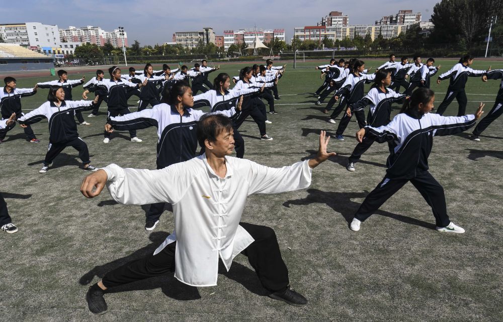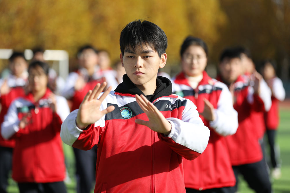 ↑2024年11月27日,河南省焦作市温县一中高二学生在体育课上练习太极拳。