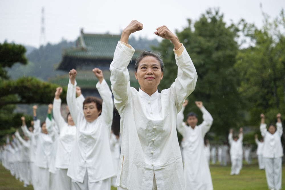 ↑2026年3月21日,在湖北省十堰市武当山遇真宫,太极拳爱好者进行太极拳展演,庆祝首个“国际太极拳日”。