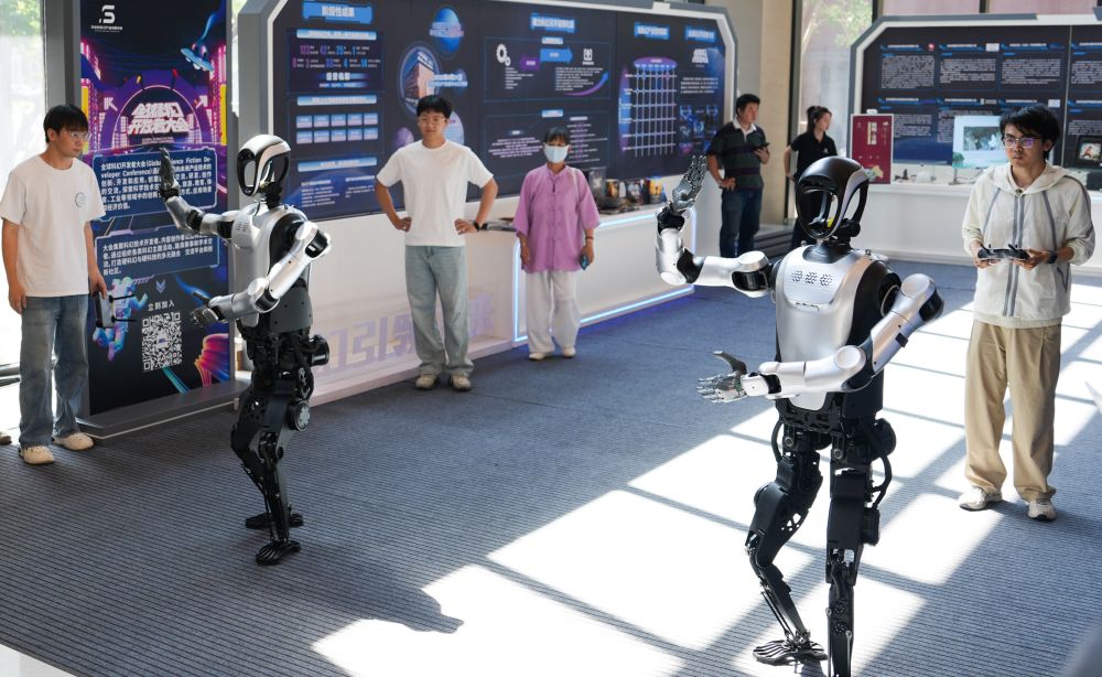 ↑2025年6月20日,乐聚机器人在北京石景山区中关村科幻产业创新中心表演“太极拳”。