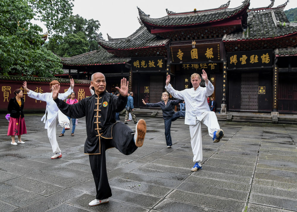 ↑2017年9月19日,峨眉山武术协会钟文华(前)在峨眉山报国寺门前教授俄罗斯游客太极拳。