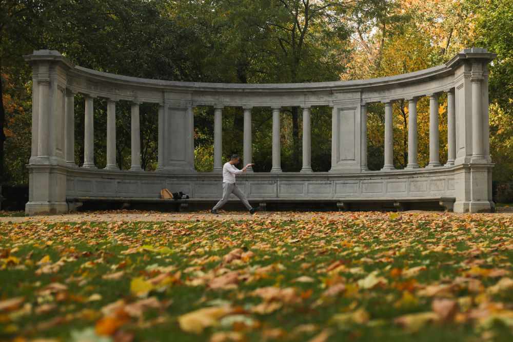 ↑2020年10月21日,一名男子在比利时布鲁塞尔的五十周年纪念公园打太极拳。