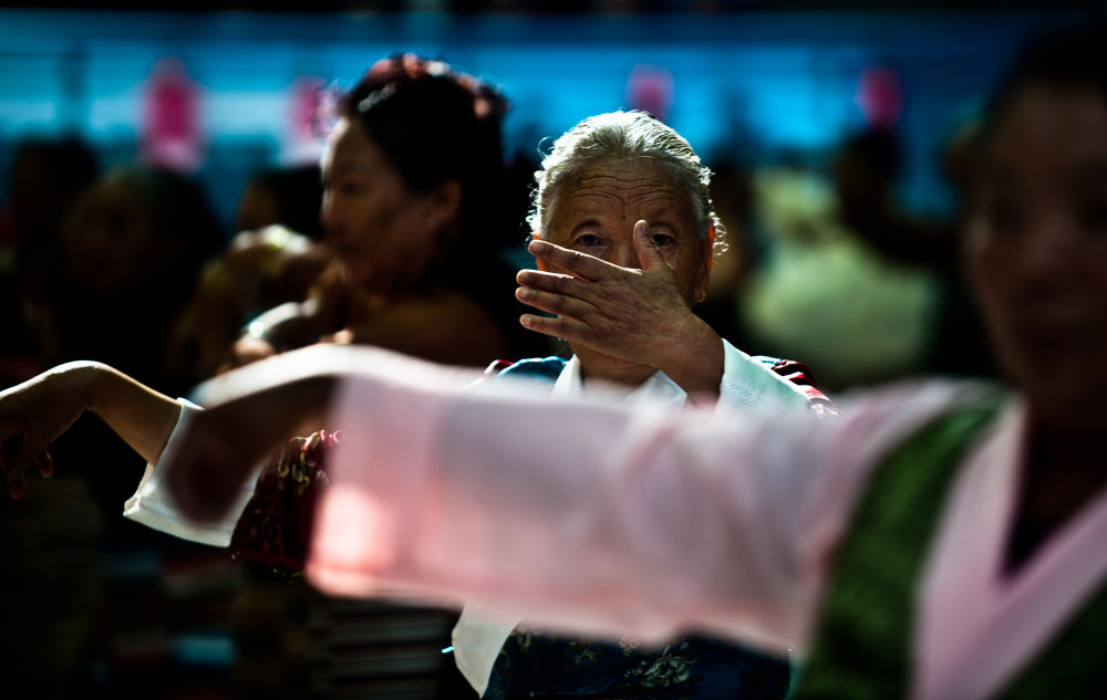↑2012年8月8日,在西藏拉萨,一名藏族老阿妈在练习太极拳。