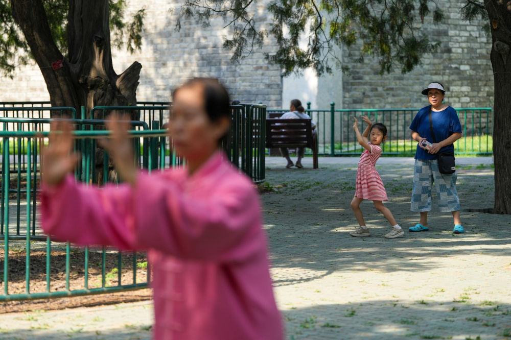 ↑2024年6月28日,在北京天坛公园,一位小朋友在模仿太极拳习练者杨淑芹练习太极拳。杨淑芹是国家级社会体育指导员,每天清晨都在这里向学员教授太极拳、太极扇等传统体育健身项目。