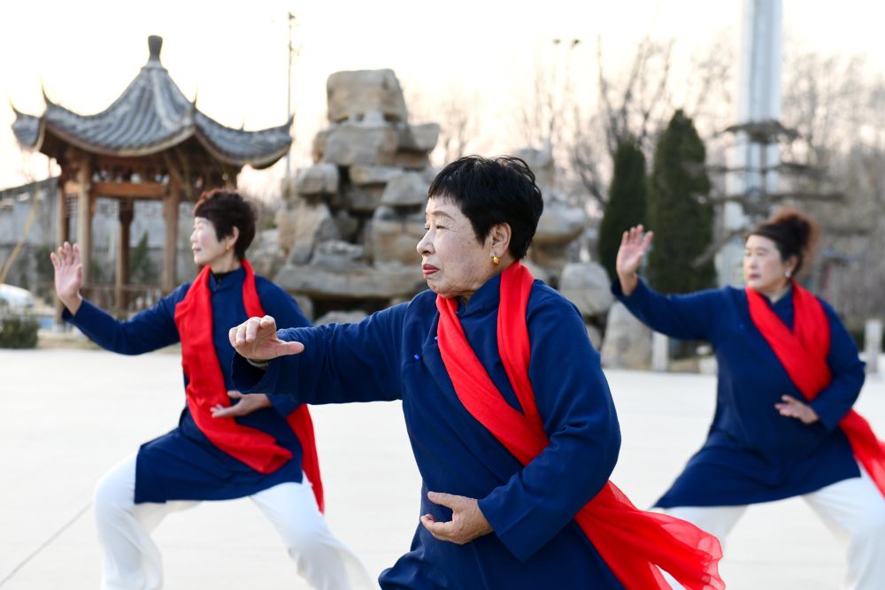 ↑2025年12月30日,在山东惠民县淄角镇文化书院广场,社区居民在练习太极拳。
