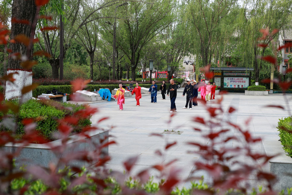 ↑2025年5月8日,健身爱好者在甘肃省平凉市柳湖公园打太极拳。