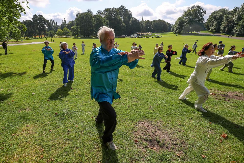 ↑2021年7月28日,在比利时布鲁塞尔的拉肯公园,当地民众练习太极拳。