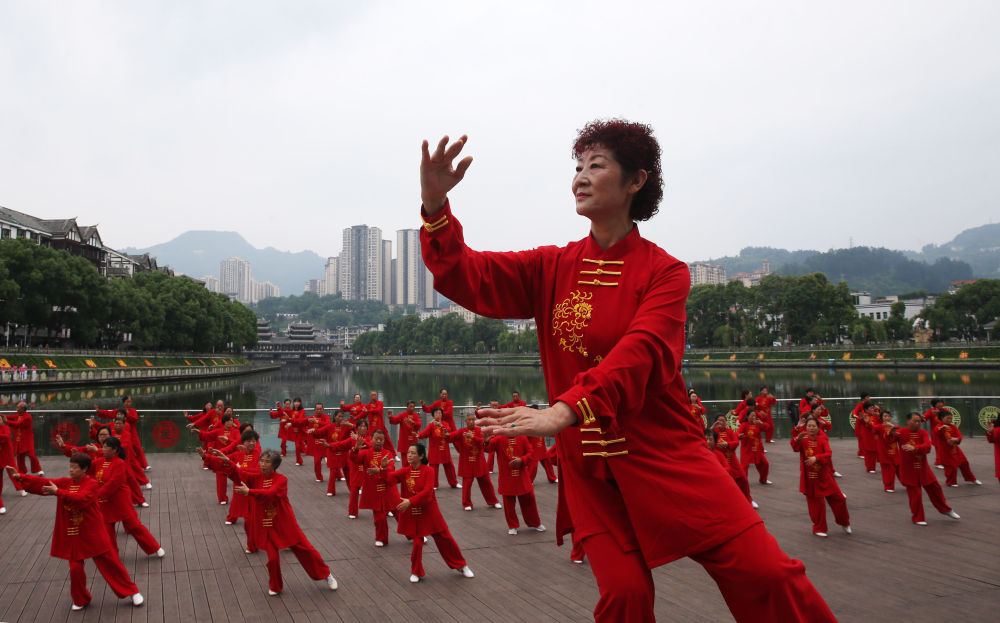 ↑2022年6月11日,在重庆市黔江区武陵水岸,太极拳爱好者在打太极拳。