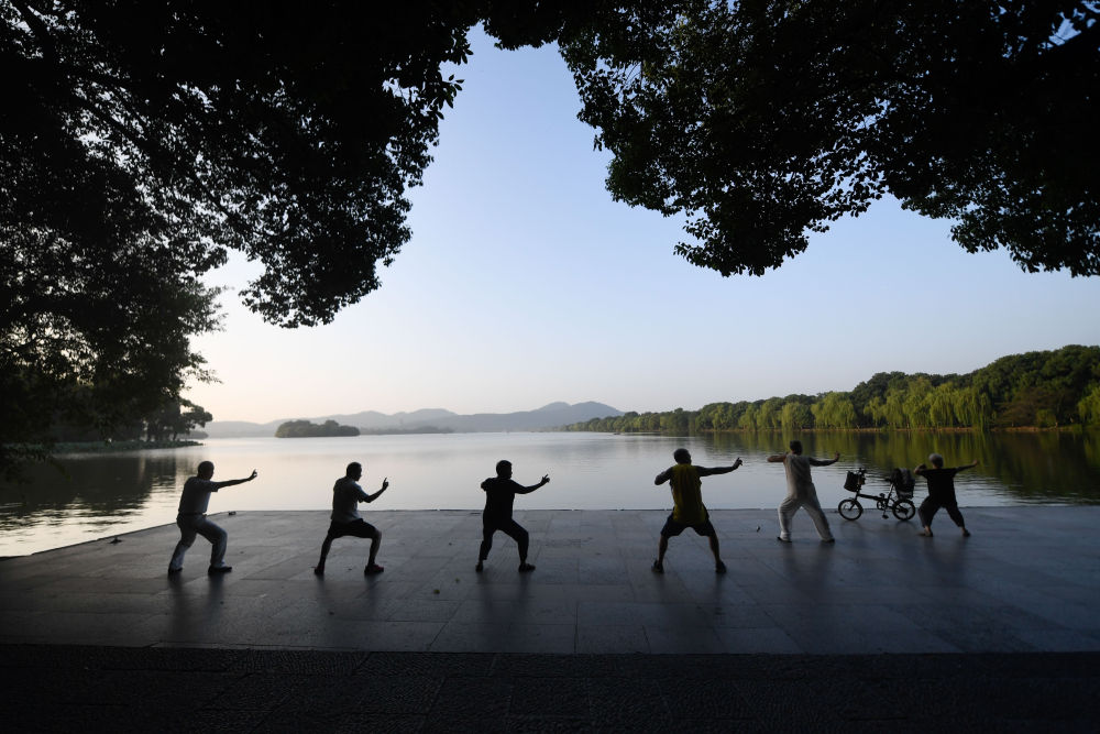 ↑2020年8月20日,晨练的人们在杭州西湖边打太极拳。
