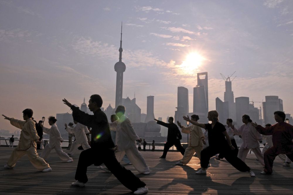 ↑2012年10月3日清晨,太极拳爱好者在上海外滩陈毅广场练习太极拳。