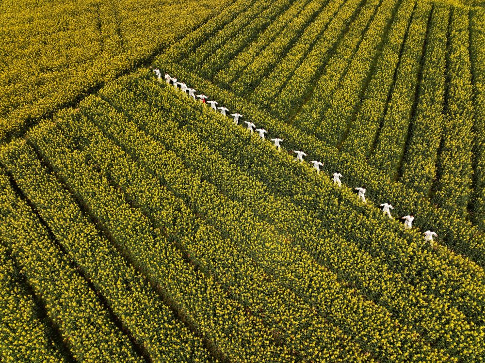 ↑2022年3月11日,太极拳爱好者在湖南省衡阳市衡阳县西渡镇的油菜田间练习太极拳(无人机照片)。