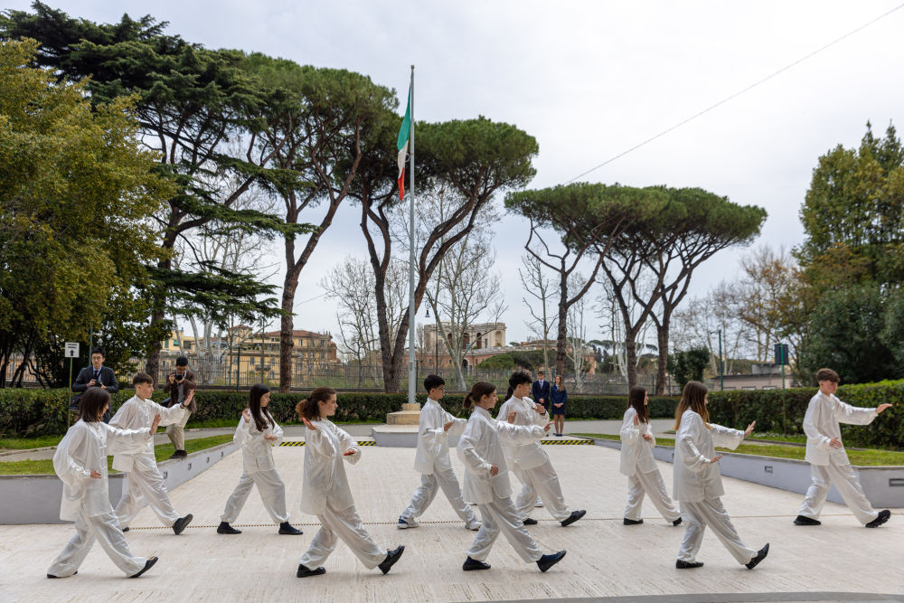 ↑2024年3月25日,在意大利罗马,罗马国立住读学校学生打太极拳。