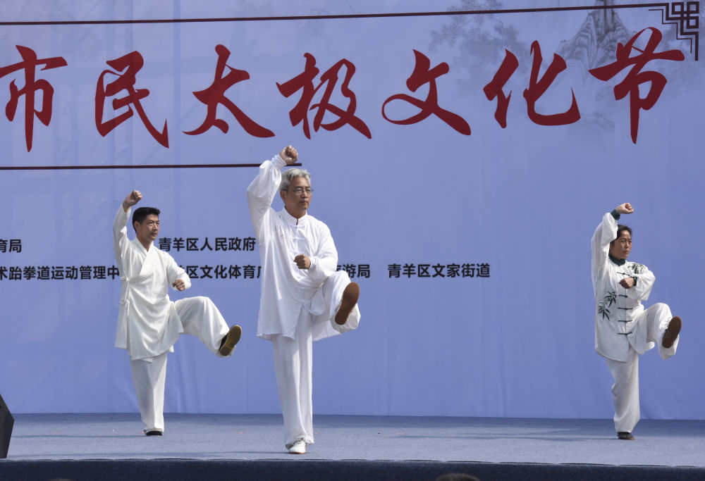 ↑2016年4月27日,太极拳习练者在“太极蓉城”第一届市民太极文化节上表演吴氏太极拳。