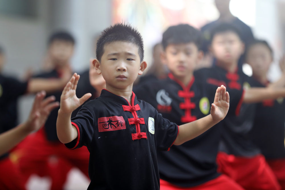 ↑2024年7月19日,在河南省焦作市温县一家太极拳武馆,孩子们在习练太极拳。