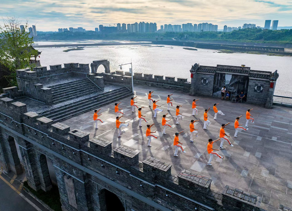 ↑2024年8月21日,在四川省广安市广安区滨江路北门城墙上,市民在打太极拳晨练(无人机照片)。