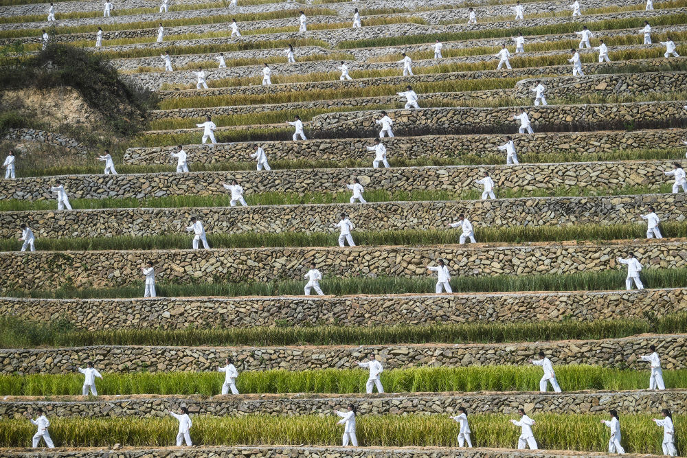 ↑2018年9月29日,太极拳爱好者在浙江省建德市大洋镇高垣村的千亩梯田上进行表演。
