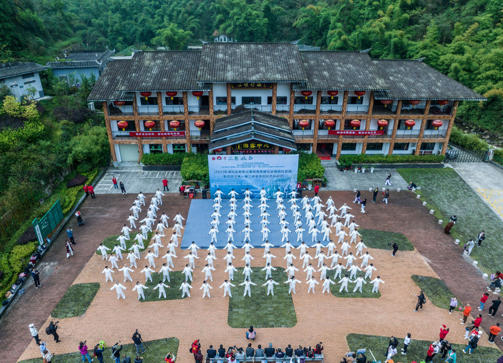↑2023年10月22日,在湖北省宜昌市秭归县,参加重阳登高活动的老年人在进行太极拳表演(无人机照片)。