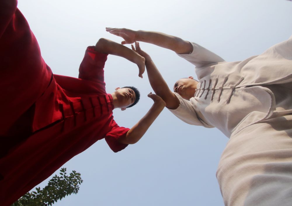 ↑1994年,陈家沟村太极武馆总教练、陈式太极拳十九代传人陈春雷(右)与学员演练太极推手功。