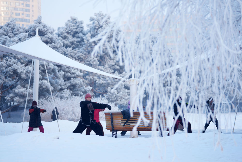 ↑2017年2月20日,在内蒙古呼和浩特蒙古风情园,晨练者在练习太极拳,沐浴春光。