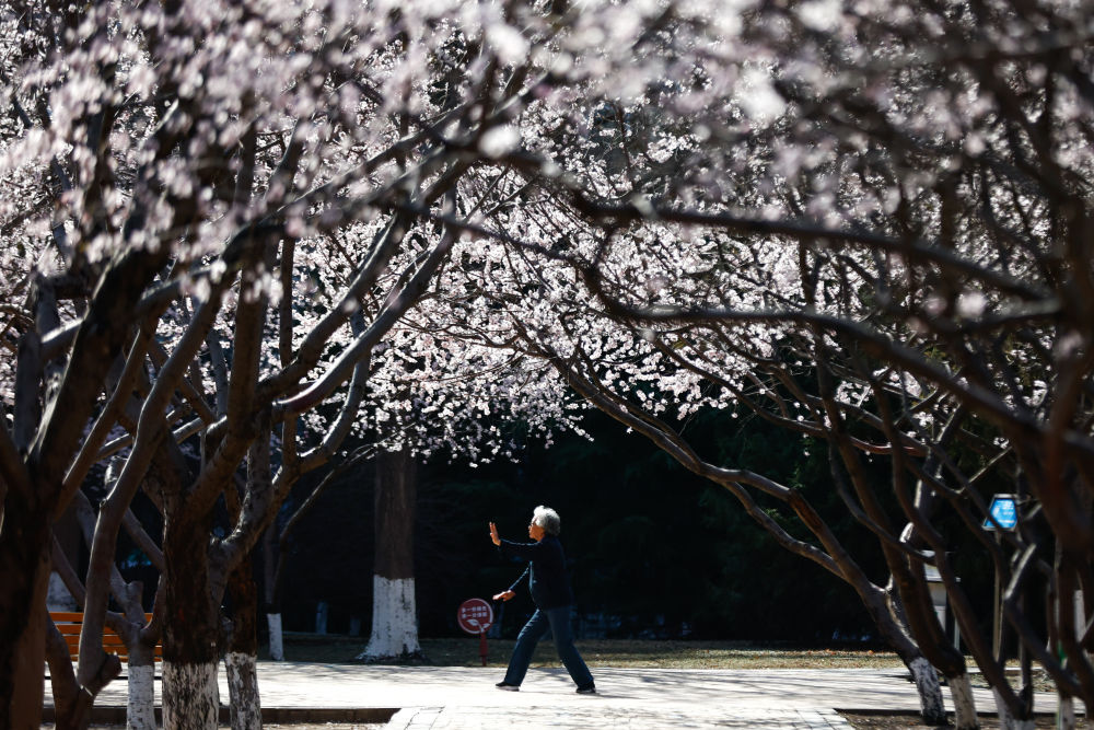 ↑2025年3月21日,一名老人在天津市滨海新区塘沽火车站前的一处广场打太极拳。