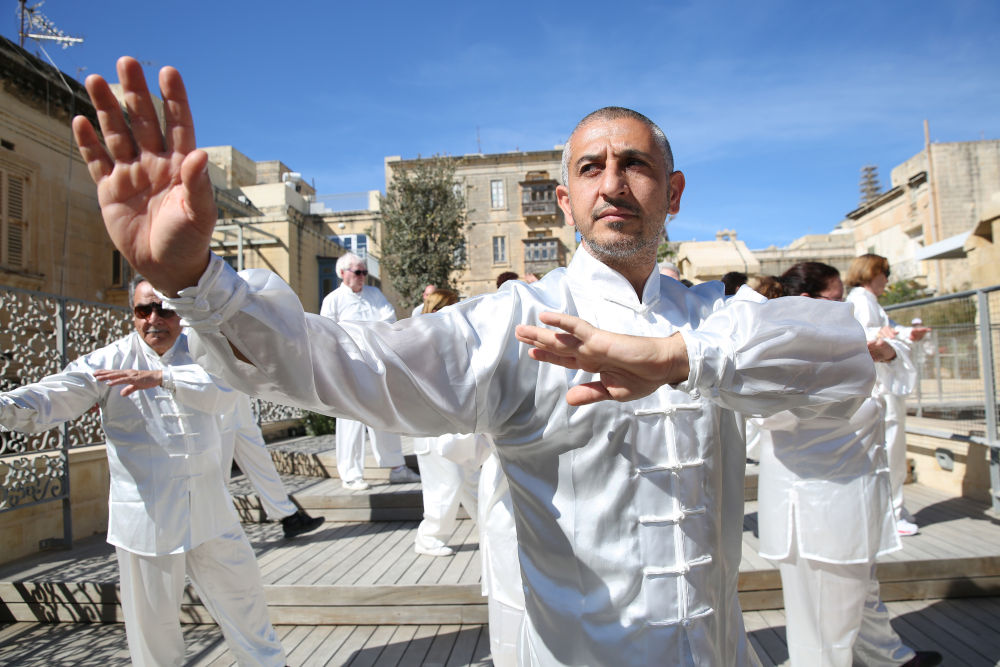 ↑2023年4月29日,在马耳他瓦莱塔,当地太极爱好者在打太极拳。