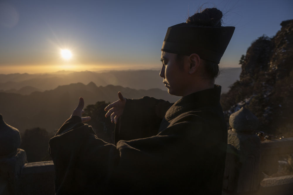 ↑2024年11月29日,一名道士在武当山金顶习练太极拳。