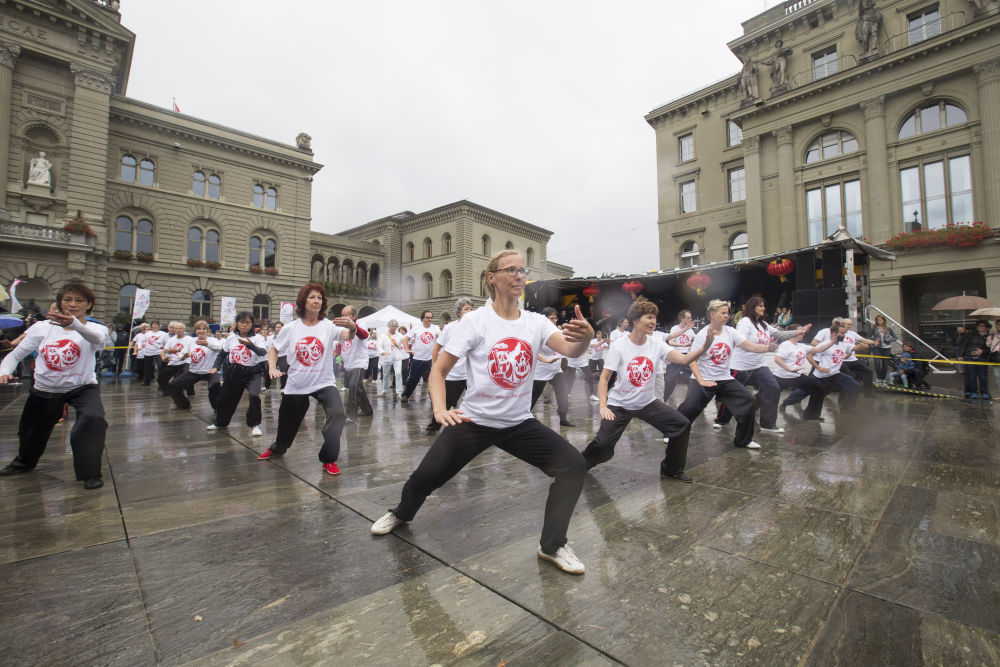 ↑2018年9月1日,在瑞士伯尔尼市中心的联邦广场,太极拳爱好者进行表演。