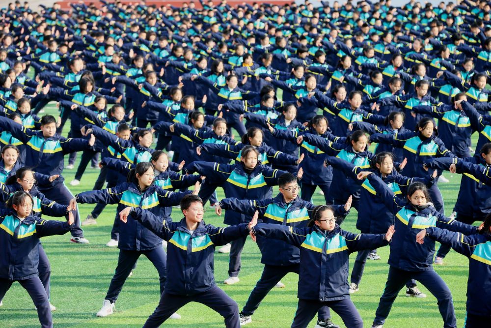 ↑2021年1月5日,山东省青岛市通济实验学校的学生在大课间打太极拳。