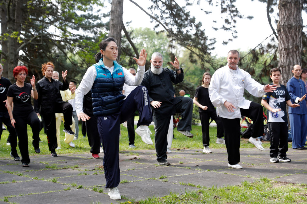 ↑2025年4月26日,在罗马尼亚布加勒斯特,中国首都体育学院副教授李凤梅(左三)带领当地太极爱好者打太极拳。