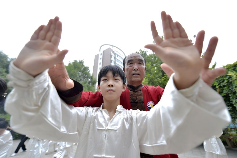 ↑2017年9月20日,沙传杨氏太极拳老架传承人赵永胜(前)传授学生们单鞭式拳法。