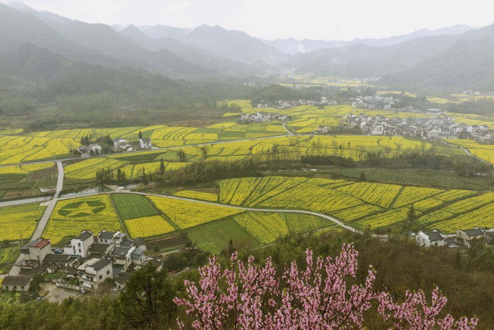↑2026年3月20日春分时节,在安徽省黟县柯村镇拍摄的油菜花田(无人机照片)。