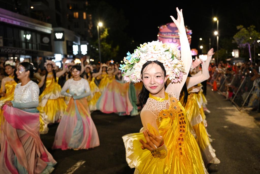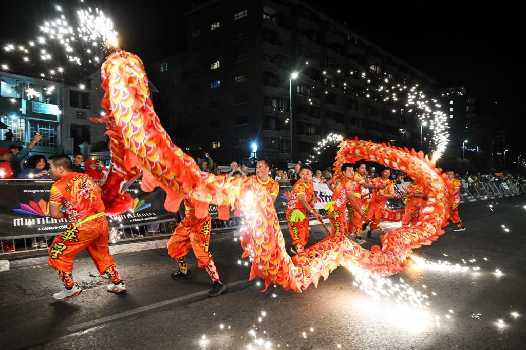 3月21日,在南非开普敦,中国方阵的表演者参加开普敦狂欢节游行。新华社发(哈比索·姆卡贝拉摄)