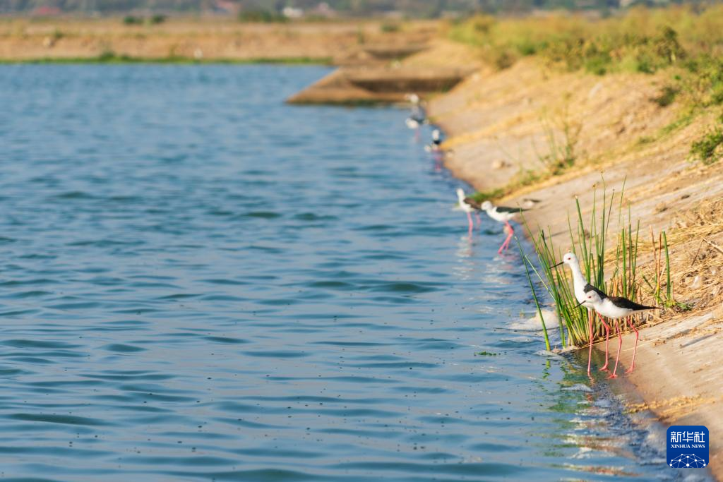 在肯尼亚内罗毕,一群黑翅长脚鹬在丹多拉污水处理厂污水处理池旁活动(2月6日摄)。 新华社记者 谢剑飞 摄