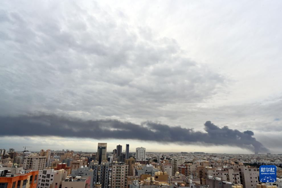 这张3月25日在科威特首都科威特城拍摄的照片显示,位于费尔瓦尼耶省的科威特国际机场一油库遭袭后冒起浓烟。新华社发
