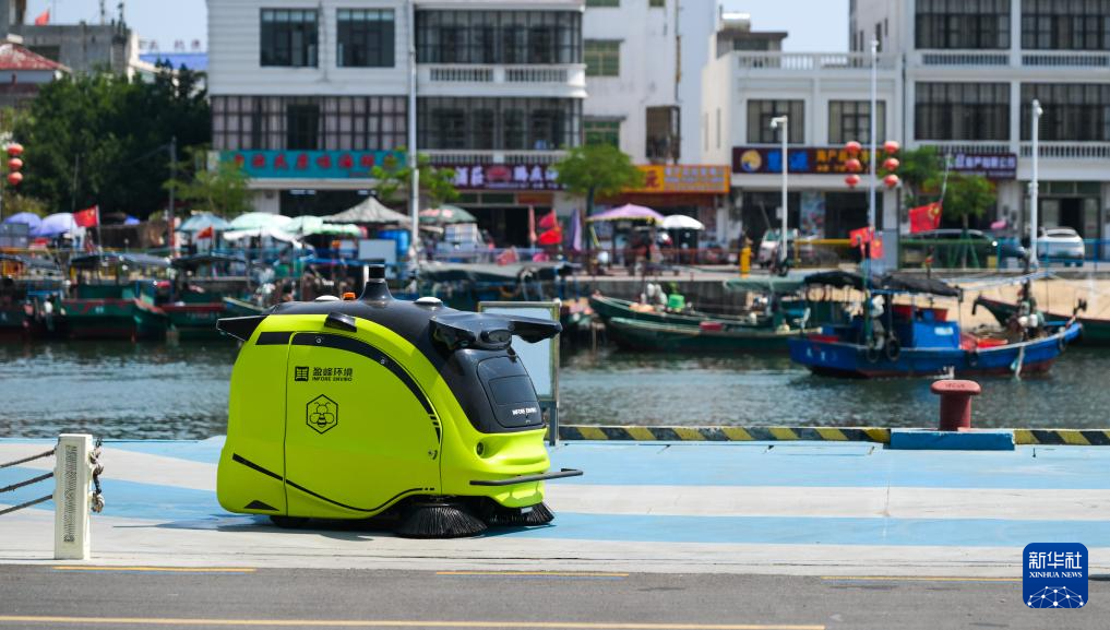 小蜜蜂智慧清洁机器人在位于海南省琼海市潭门镇排港村作业(3月25日摄)。