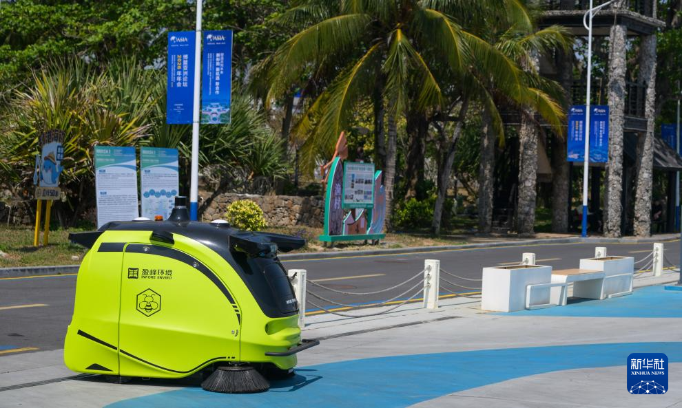 智能清扫机器人在海南省琼海市博鳌镇街头作业(3月25日摄)。