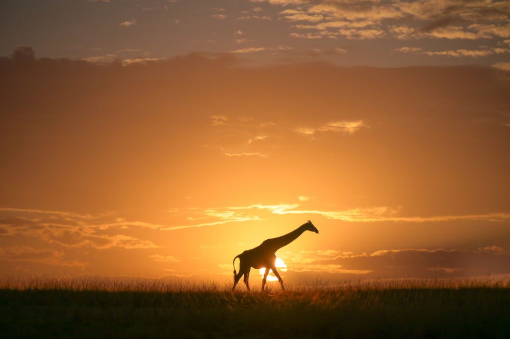 日出时分,在肯尼亚马赛马拉国家保护区,一只长颈鹿在草原上行走。新华社记者杨光摄