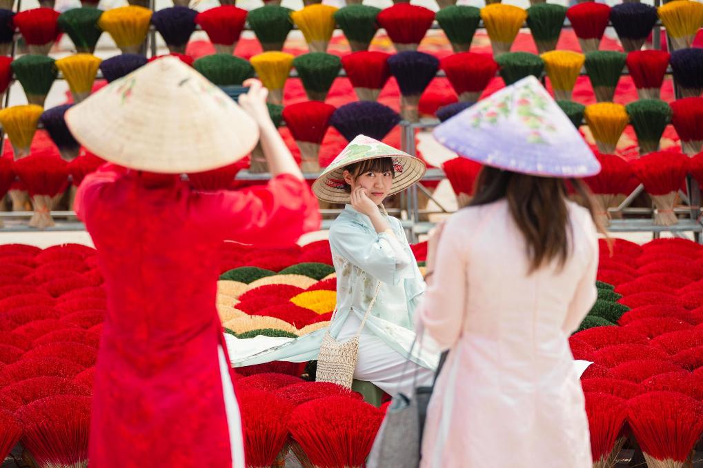 3月24日,在越南广富桥村,游客在晾晒的香签旁拍照。新华社记者朱炜摄