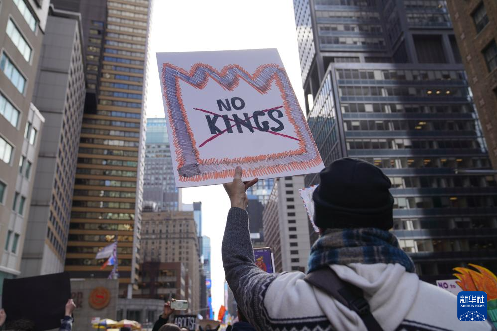 3月28日,在美国纽约,抗议者手举“不要国王”标语牌。 新华社记者 张凤国 摄