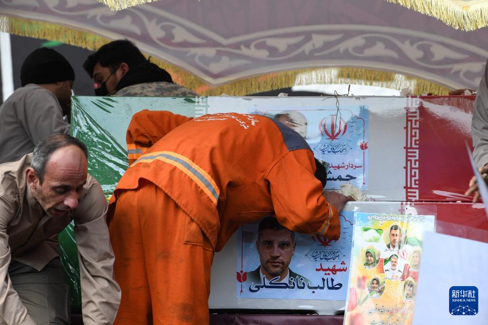 4月1日,在伊朗首都德黑兰革命广场,民众参加为伊朗伊斯兰革命卫队海军司令坦格西里、伊朗武装部队总参谋长顾问贾姆希德·埃哈基及伊朗武装部队军事人员举行的告别仪式。新华社记者 沙达提 摄