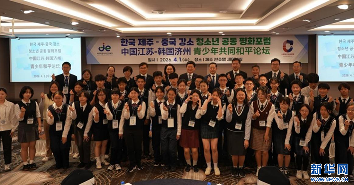 新华网韩国济州4月2日电 (记者张粲 孙一然)2026年中国江苏-韩国济州青少年共同和平论坛1日在韩国济州特别自治道济州市举行。来自中国江苏省南京外国语学校与韩国济州当地的师生代表齐聚一堂,在纪念南京大屠杀89周年和济州4·3事件78周年历史背景下,通过交流对话与实践活动,表达了铭记历史、珍爱和平、携手面向未来的共同心声。
