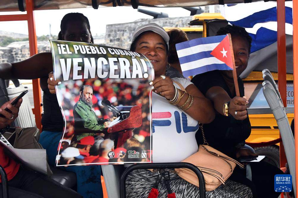 4月2日,民众手持已故古巴革命领袖菲德尔·卡斯特罗的海报在古巴哈瓦那海滨大道参加反对帝国主义、捍卫古巴革命的游行活动。