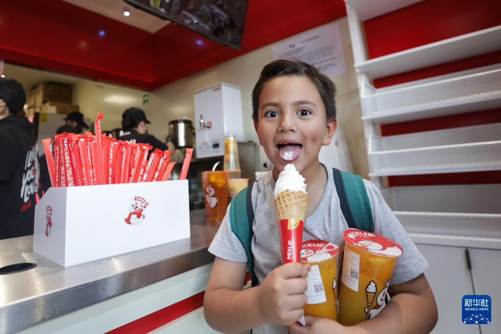 4月1日,在墨西哥首都墨西哥城的宪法广场,一名儿童手持蜜雪冰城的产品。