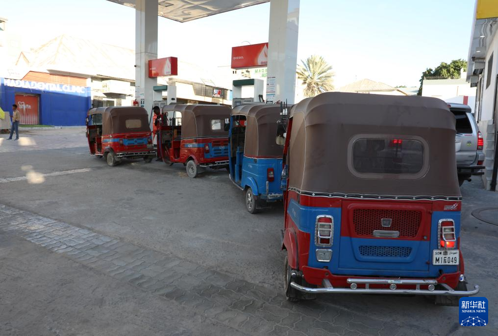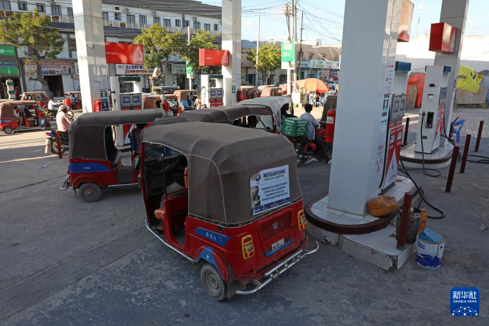 4月2日,在索马里首都摩加迪沙,三轮车在一处加油站加油。新华社发(哈桑·巴希摄)