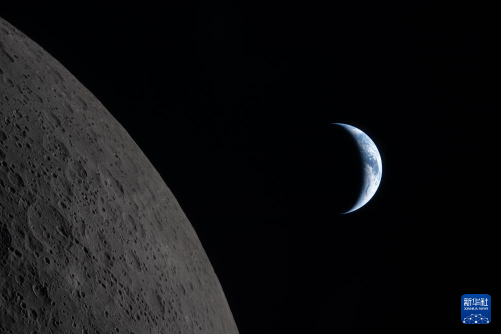 这是从执行“阿耳忒弥斯2号”载人绕月飞行测试任务的“猎户座”飞船上拍摄的月球(左)和地球(4月6日摄)。新华社发(美国国家航空航天局供图)